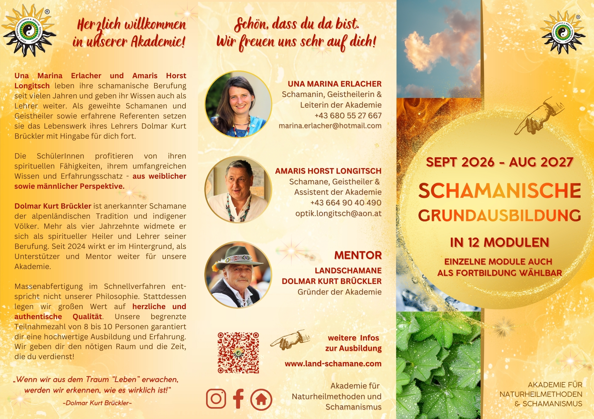 „Liebe Marina, lieber Horst, ich danke euch für eure vielen perfekt vorbereiteten Rituale. Eure Verbundenheit zu Mutter Natur und den Elementen war sofort spürbar und ich bin bereits selbst voll im Tun! Besonders gut gefällt mir dass ihr die weibliche und männliche Herangehensweise sehr gut darstellen könnt. Manchmal kraftvoll und dann wird wieder sensibel gearbeitet, so fehlt nicht wie sonst üblich, ein Teil. Auch sorgt ihr stets für gegenseitige Wertschätzung innerhalb der Gruppe. Ich freue mich auf noch viele weitere Kurse in der Akademie und schöne Stunden in und um Mutter Natur! DANKE euch von Herzen und bis bald“